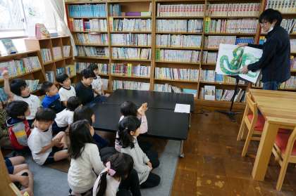 図書室に集まった子どもたちは低学年が多かったですが,読み聞かせの前にアレックス先生に動物の名前を教えてもらう時にも,英語の発音に抵抗なく,聞こえた通りに発音していました。