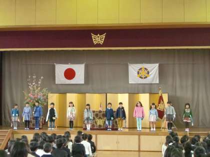 始業式のあと,10時30分から入学式を行いました。少し肌寒く感じられる天候の中でしたが,81名のかわいい1年生を迎え,体育館の中にはとても幸せな時間が流れました。式の最後には,2年生の代表児童による「お迎えの言葉」の発表もありました。舞台の上で胸を張って発表する2年生の姿に1年間の成長を感じることができました。