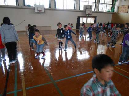 1番はそのまま歌い,2番からは、体育館にひいてあるラインの上を「さんぽ」しました。