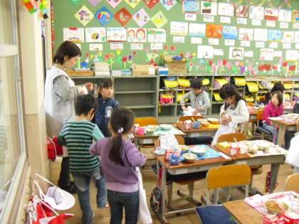 給食当番の子どもたちはエプロンをたたむのに少し苦戦していましたが,先生に教えてもらいながら一生懸命たたんでいました。