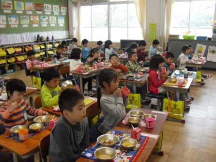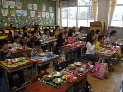 初めての給食は,ごはん・ハッシュドビーフ・じゃがいものソティ・牛乳でした。