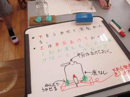 「新しい空気をあれば燃え続ける!」という考えから実験方法を考えました。
