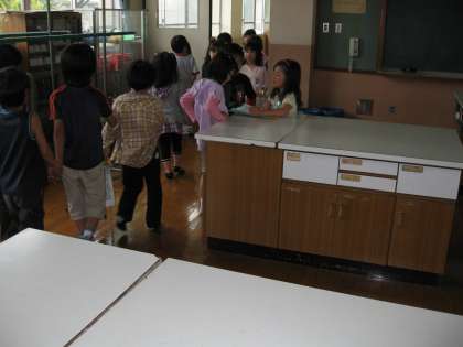その後は,子どもたちが楽しみにしていた学校探検です。2年生のお兄さんやお姉さんが手をひいて,学校の様々なところを案内してくれました。家庭科室や理科室,図書室や図工室の中にも入り,教室にはどのようなものがあるのか,なにをするところなのかを見てきました。