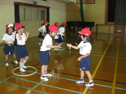 1年生の体育では,「じんとりあそび」をしています。両チームの先頭が走り出し,2人があった場所で,互いの両手をあわせてジャンケンをします。子どもたちは,ジャンケンに負けたら急いで元の場所にもどったり,友だちを一生懸命応援したりと,とても楽しんでいました。
