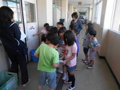 体育館でグループになって,学校を探検して回りました。