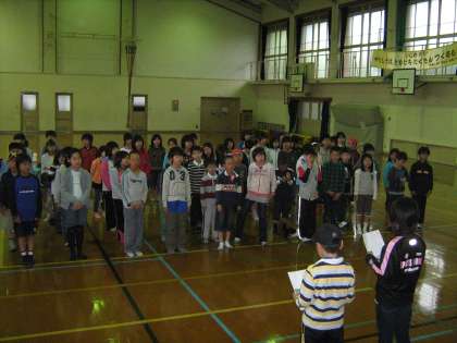体育館での出発式。初めての宿泊学習に胸を膨らませている4年生です。