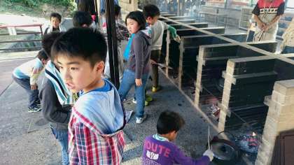 かまどの係は暑さと熱さとの戦いですが,美味しい「すき焼き風煮」のためです。