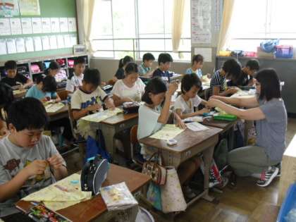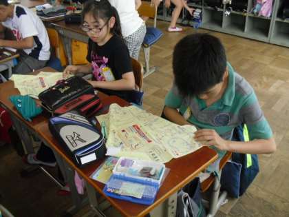 家庭科では,さいほうをはじめています。自分で用意したさいほうセットを大切に使いながら,玉結び,なみぬい,玉止めを練習布で練習しています。家でも自主練お願いします。今後は,ナップサックを作る予定です。