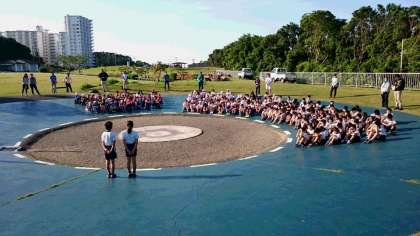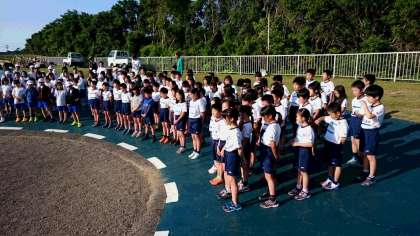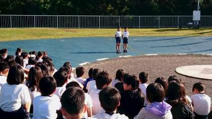 一緒に活動している竹田小学校,山階小学校と合同の「朝の集い」です。