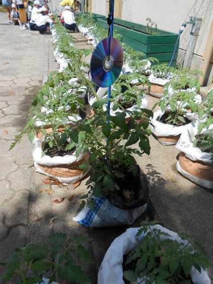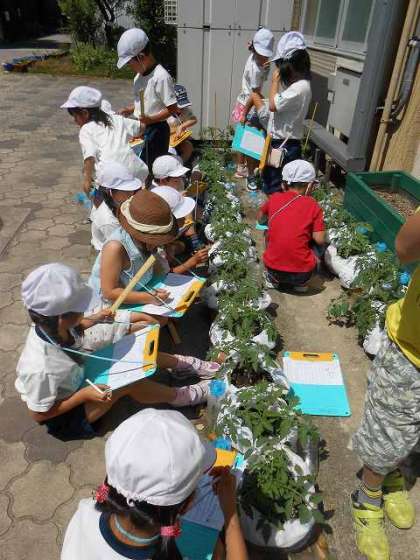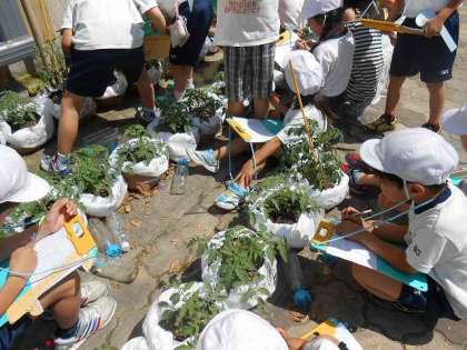 国語の「かんさつ名人になろう」の単元で,トマトの苗を観察しています。