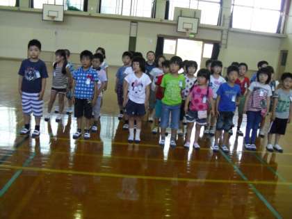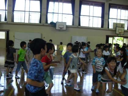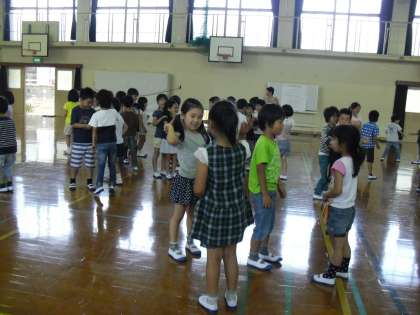 1年生3つのクラスみんなで,学年集会をしました。体育館に集まり,1年生の学年目標を唱えました。そして,「すてきな一歩」をうたう真下。この歌は,全校集会でも歌う歌です。そのあと,「かもつれっしゃ」をみんなで歌いながら,仲良く遊びました。1年生は「3クラス,みんなが友だちで、仲間だよ」という気持ちが持てるようになってほしいなと願っています。
