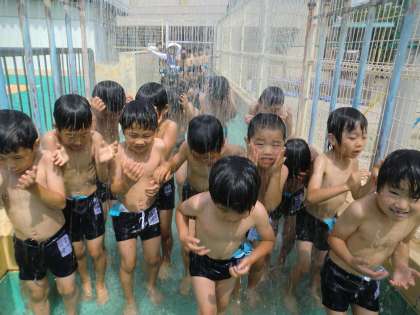 シャワーにかかるときは,♪「かえるの歌」を歌います。