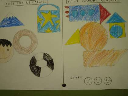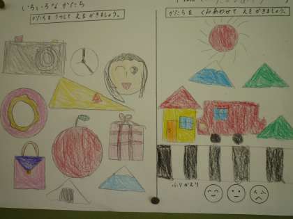 つみきの面をうつして,絵をかきました。さんかく・しかく・まるなどを利用してどんな絵が描けそうか,イメージを膨らませて書きました。