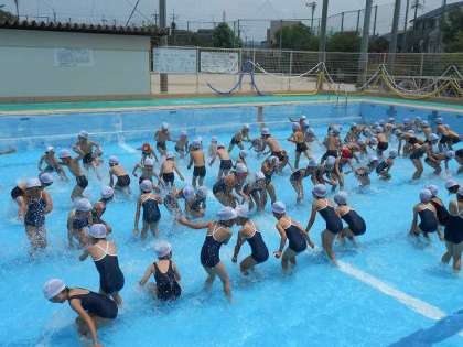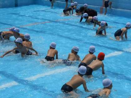 バディの確認・準備体操・足洗い・腰洗い・シャワー,どの場面でも興奮を抑えきれず,目をキラキラさせていた子ども達でした。
