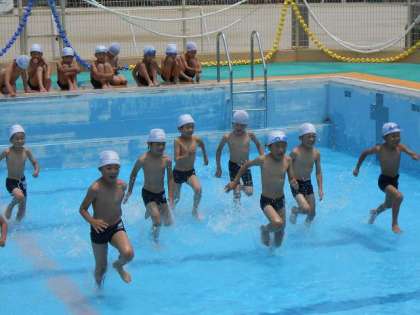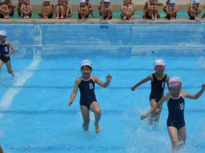 途中で何回も安全についての注意をしました。力いっぱいプールを楽しむには,しっかり安全を守ることが何よりも大事だからです。