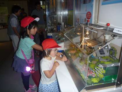 ライトを当てると模型が動き出す太陽光発電の仕組みが楽しくてじっと見入ったり,風や空気の力で物の形が変わる様子を見たりと,楽しい仕掛けに釘付けでした。