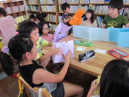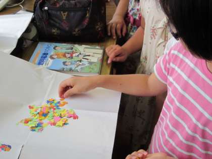 今日の工作は,「画用紙1枚で本をつくろう」というテーマでした。一人一人が好きな色の画用紙を選んで,まずは台紙をつくりました。そこへ色えんぴつで絵を描いたり,思い出の写真を貼ったりして『世界にひとつのマイ絵本』をつくりました。