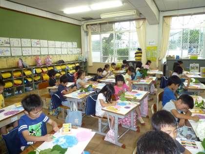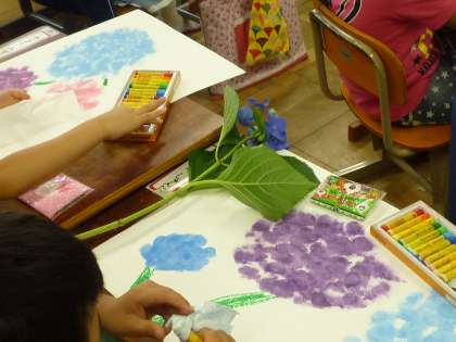 タンポで,えのぐをポンポンポンと花の形におしました。