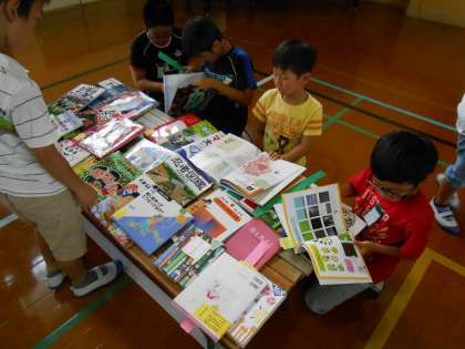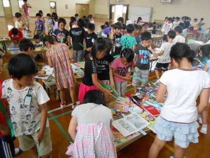 体育館にいっぱいの本が並び,子ども達が本の間を歩いて回りました。