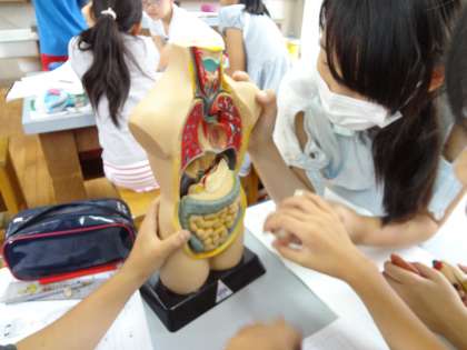 人体模型を使い,学習した臓器を確認しました。肺や心臓の場所などを確認し,どんなはたらきをしているのかをまとめました。