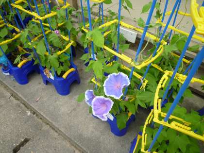5月に種まきしたアサガオが咲きだしました。ピンクや青や紫などきれいな色です。