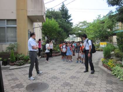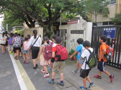 学校を出発していく5年生です。