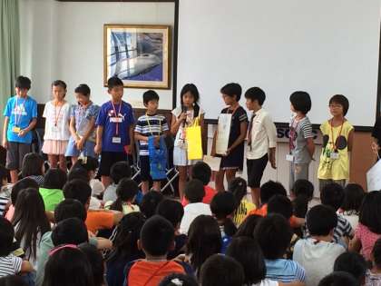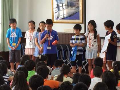 第二回全体ミーティングの様子です。代表者が,各ブースのアピールを行いました。