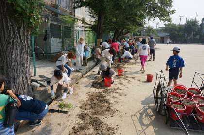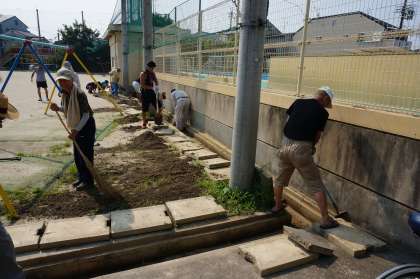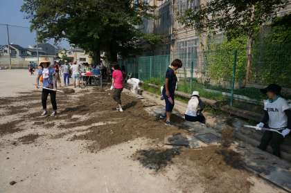8月2日(日)の朝,桂東体育振興会の皆さんに運動場の側溝の掃除をしていただきました。