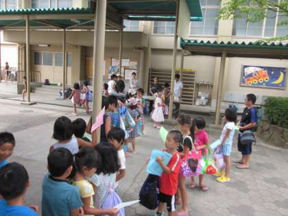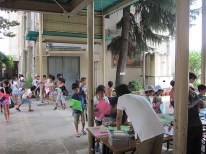 夏休みのプール指導は,本日で終了となります。午前中は低学年の部ですが,受付の机の前にはいつもより多くの子どもたちが行列をつくって並んでいました。