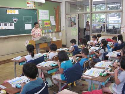 写真は,1年生の音楽の学習と。2年生の国語の学習の様子です。みんな一生懸命ですね。