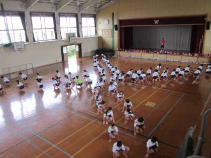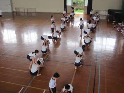 組体操の練習を日々がんばっています。隊形移動のポイントを確認したり,新しい技に挑戦したりしました。本番に向けて練習あるのみです。