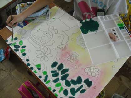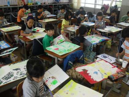 図画工作科で,お話の絵の学習の続きをしました。今日は絵具を使っている子が多く,完成に向けて想像を膨らませながら描いていました。次の時間も,色の塗り方や色遣いに気をつけて,描いてほしいと思います。