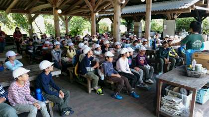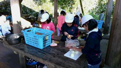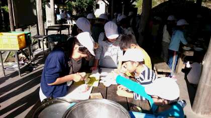 食器や食材の説明を聞いて、いよいよ野外炊事の開始です。