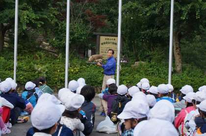 山の家の先生から周辺の山にいる昆虫や動物のお話を聞きました。写真はイノシシの子ども「ウリ坊」のはく製です。