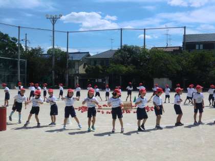 並んで行進して入場し,「手をつなごう」のダンスをおどり,玉入れをし,終わったら,退場という流れを確認して,真剣に練習に取り組みました。