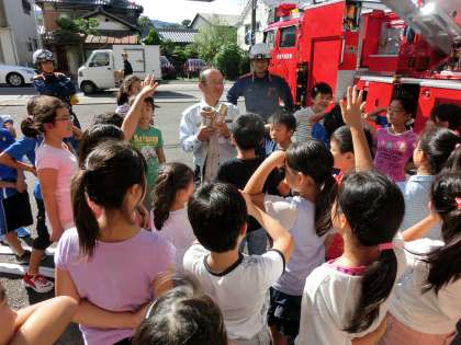 後半は外に出て,はしご車や消火用ホース,ホース用のジョイントなどを,どう使うのか説明してもらいながら見せてもらいました。