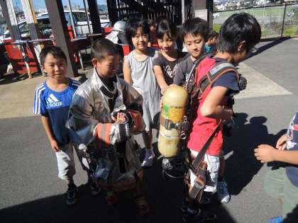 消火活動時に装備する耐火スーツやヘルメット,空気呼吸器なども装着させてもらいました。
