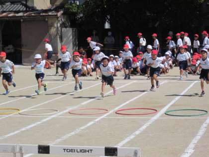 後ろ向きの体育すわりからスタートした1年生のにこにこレース。くぐったりとんだりする姿がとてもかわいかったです。入学してからもう半年。大きくなってきましたね。