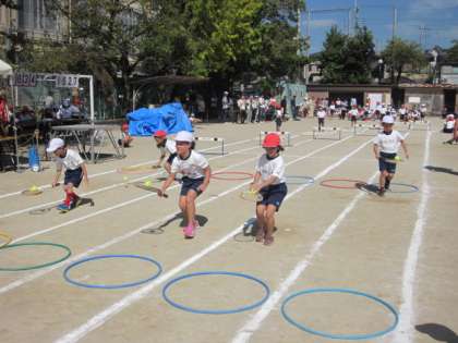 跳んだり,回ったり,くぐったり・・・。2年生のかわいい障害物走に場内があったかい雰囲気に包まれました。子どもたちは必死でした。
