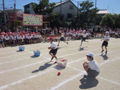 3年生は障害物走がラストの競技です。ゴールに向かってくぐったり,ミニハードルをケンケンでとんだり・・・。最後は離れたところにある箱をねらって玉を投げ入れてから走っていました。