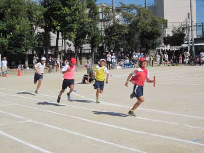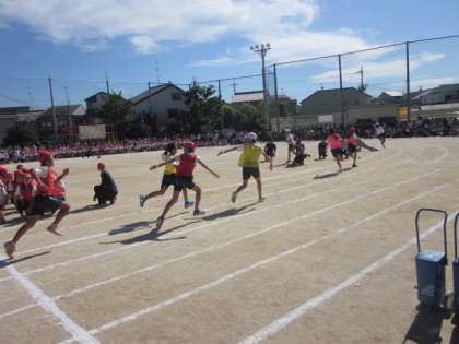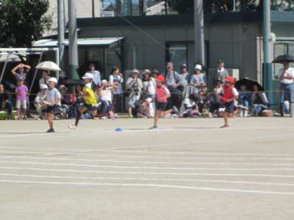 これまた運動会の華のひとつ,高学年による「二色対抗リレー」です。点数が入る競技はこれが最後。応援する側にも自然と力が入ります。赤組・白組からの大きな応援を受けて,一生懸命バトンをつないで走った桂東の子どもたち。かっこよかったです。