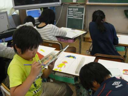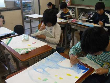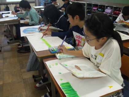 お話の絵を描いています。読み聞かせの中から,自分の好きな本を選んで,想像を膨らませました。絵の具を使って,色をつけています。作品の仕上がりが楽しみです。