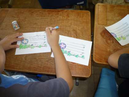 「かみをそめるとたのしいよ。」「いろみずであそべるよ。」など,経験から出たメッセージを書いていました。