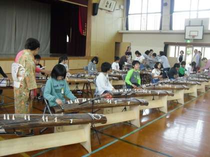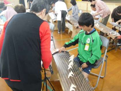5年生は,伝統文化の学習ということで,桂東女性会の方々に,お琴を教えていただきました。はじめてお琴を見て,聴いて,弾いたという子どもも多くいました。実際につめをつけて ,「さくら」を演奏しました。