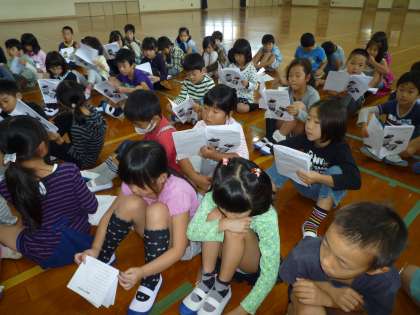 体育館に集まって,学習発表会のはじめての練習をしました。