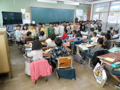各クラスでそろってあいさつした後,お菓子を渡しました。