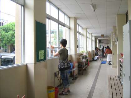 今月は,保護者のみなさまにも,校内清掃担当学年と一緒に清掃していただきました。おもに手洗い場や廊下の窓ガラス・階段等の掃除をてきぱきと…。あっという間にぴかぴかになりました。