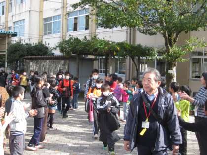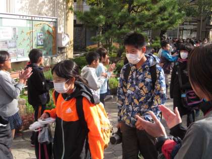 激戦が予想される今年の西京東支部予選会。本番の試合に向かう6年生の子どもたちを5年生が花道をつくって激励の拍手で送りました。みんな緊張した顔で校門を出て行きました。心の中は熱く燃えていたことでしょう。