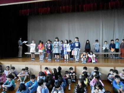 その様子を,舞台下で待機している他のクラスの子ども達がついつい振り返って見てしまいます。