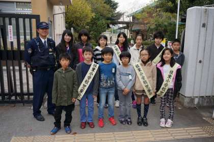 初日は,3年生と6年生の代表委員さんです。今日は通学路の横断歩道に立っていただいた桂交番のお巡りさんも一緒に挨拶してくださいました。いつも子どもたちに声をかけてくださり,ありがとうございます。